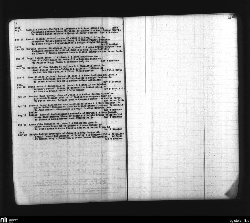 Maryborough; County of Laois; Diocese of Kildare and Leighlin. Marriages, Aug. 1938 to Apr. 1942