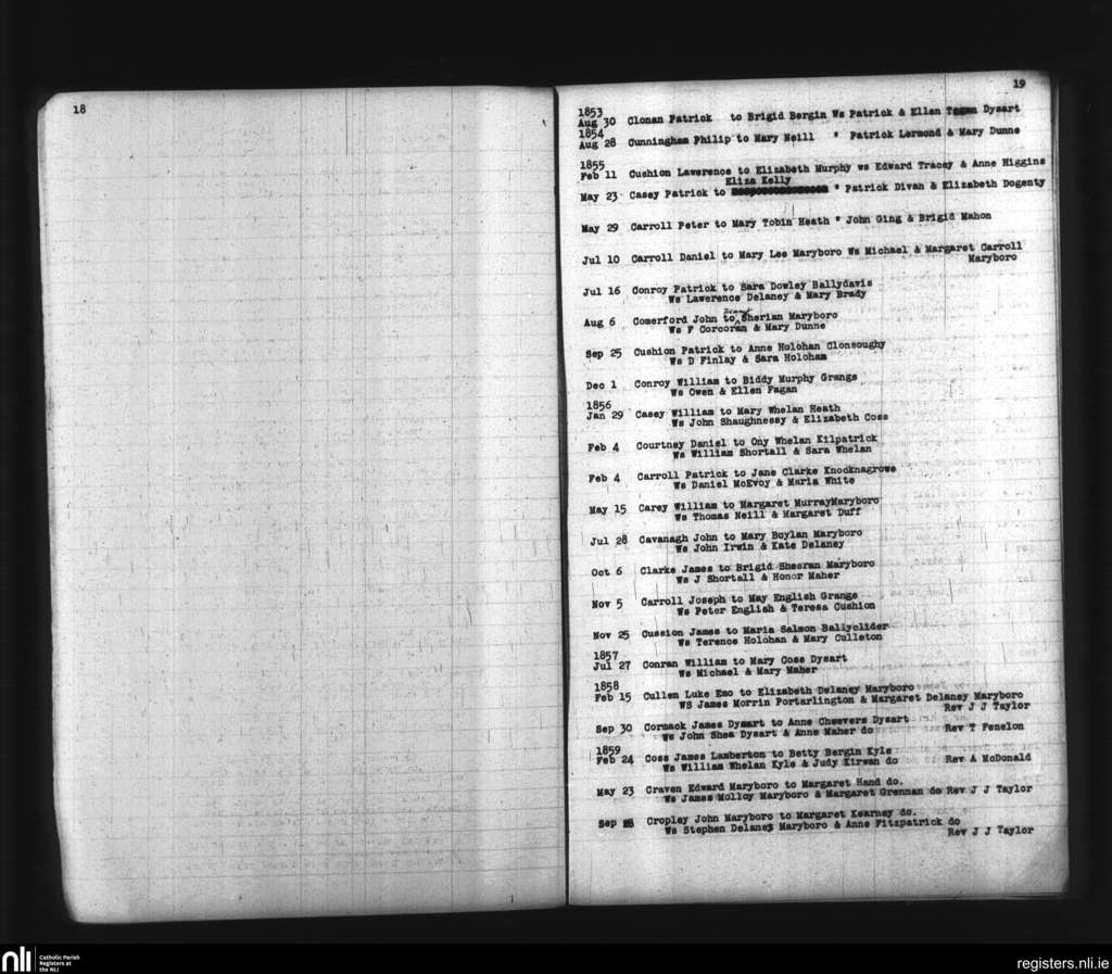 Maryborough; County of Laois; Diocese of Kildare and Leighlin. Marriages, Aug. 1853 to Sep. 1859