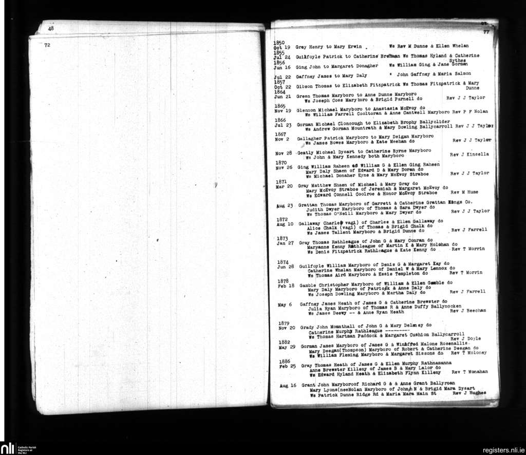 Maryborough; County of Laois; Diocese of Kildare and Leighlin. Marriages, Oct. 1850 to Aug. 1886
