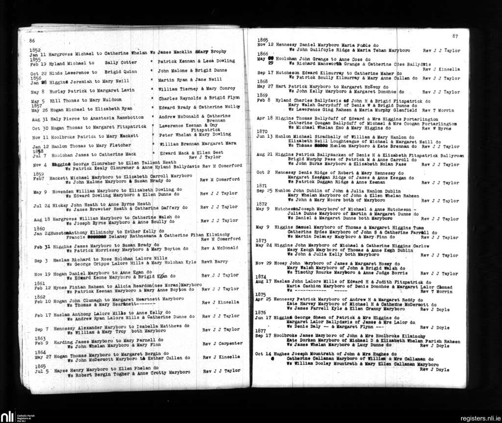 Maryborough; County of Laois; Diocese of Kildare and Leighlin. Marriages, Jan. 1852 to Oct. 1877