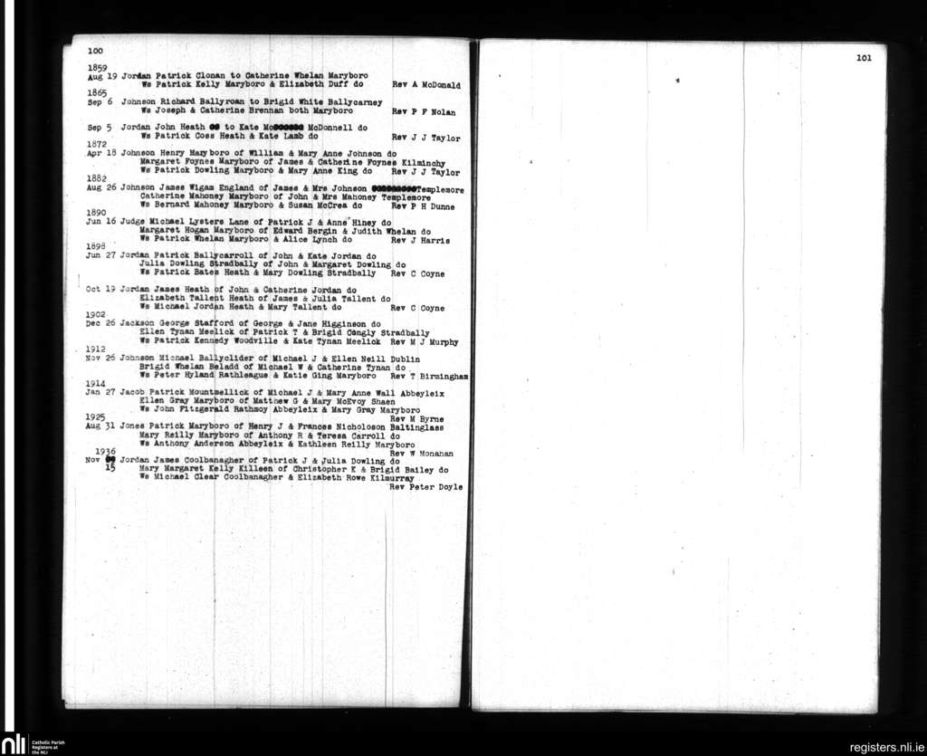 Maryborough; County of Laois; Diocese of Kildare and Leighlin. Marriages, Aug. 1859 to Nov. 1936