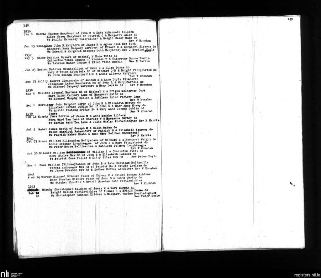 Maryborough; County of Laois; Diocese of Kildare and Leighlin. Marriages, Jan. 1936 to Feb. 1942