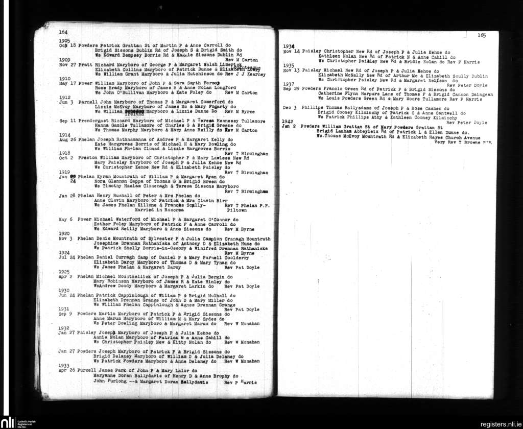 Maryborough; County of Laois; Diocese of Kildare and Leighlin. Marriages, Oct. 1905 to Jan. 1942