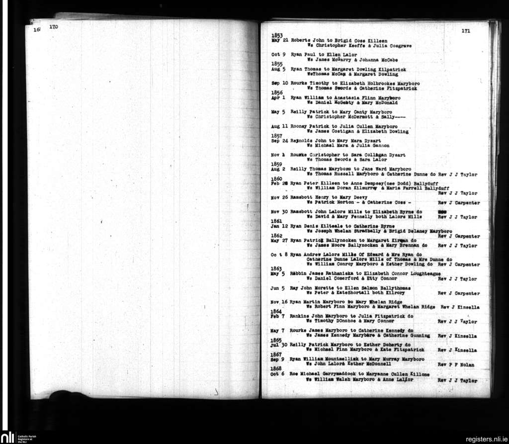 Maryborough; County of Laois; Diocese of Kildare and Leighlin. Marriages, May 1853 to Oct. 1868