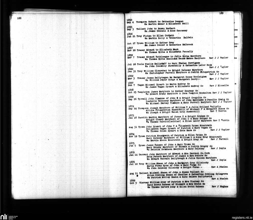 Maryborough; County of Laois; Diocese of Kildare and Leighlin. Marriages, Sep. 1850 to Oct. 1889