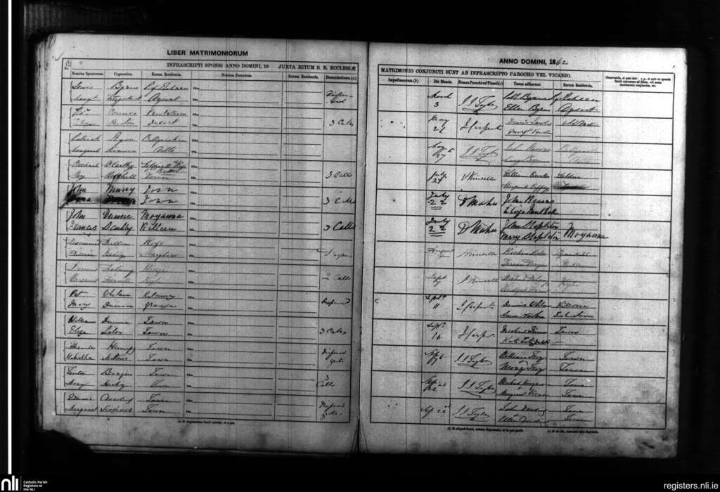 Maryborough; County of Laois; Diocese of Kildare and Leighlin. Marriages, Mar. 1862 to Sep. 1862