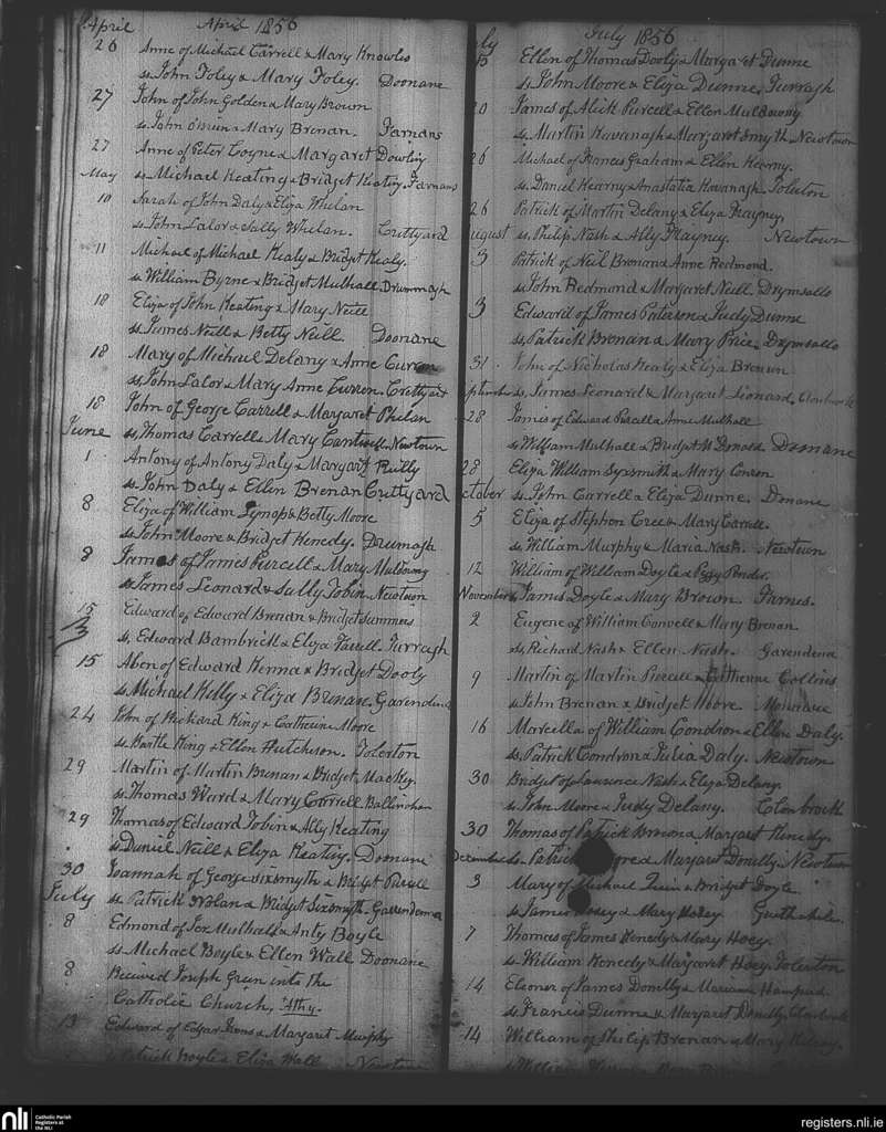 Mayo and Doonane; County of Laois; Diocese of Kildare and Leighlin. Baptisms, Apr. 1856 to Dec. 1856