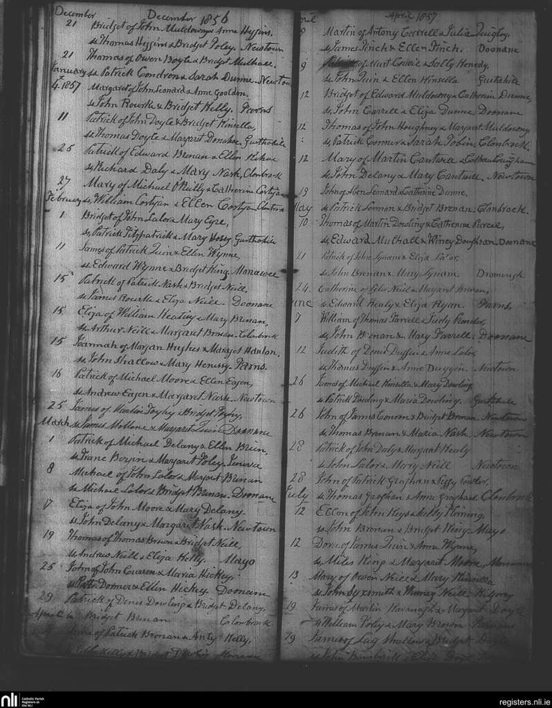 Mayo and Doonane; County of Laois; Diocese of Kildare and Leighlin. Baptisms, Dec. 1856 to July 1857