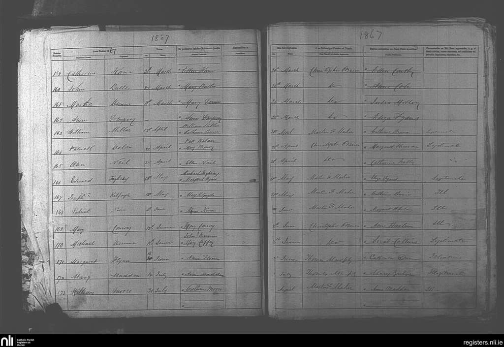 Mountmellick; County of Laois; Diocese of Kildare and Leighlin. Baptisms, Mar. 1867 to Aug. 1867