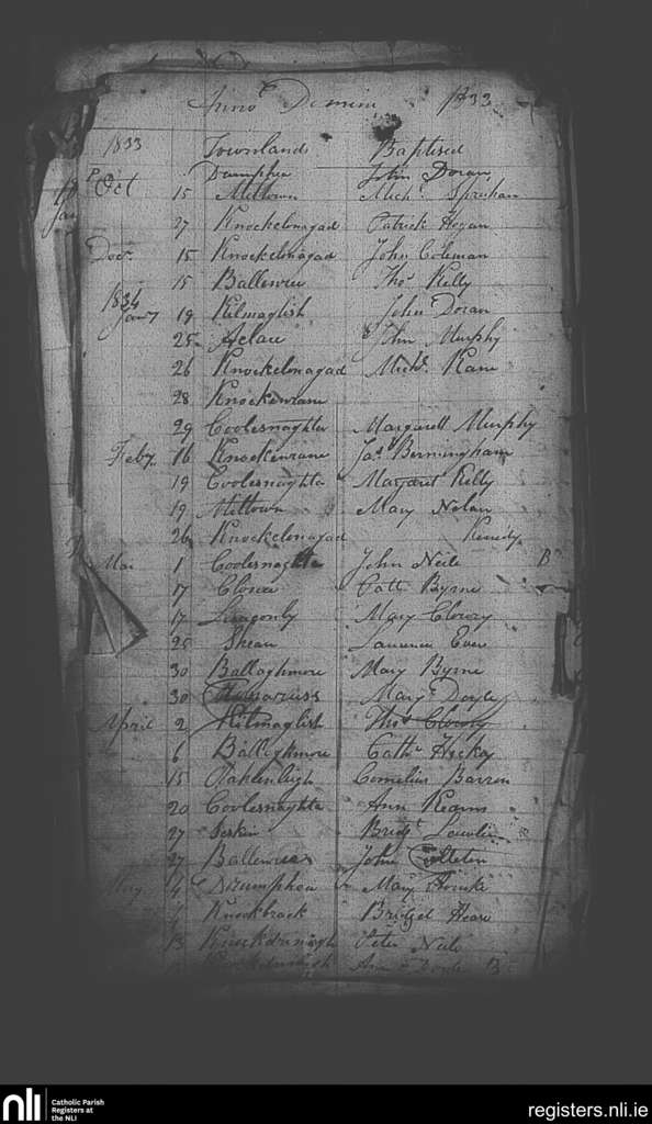 Myshall; County of Carlow; Diocese of Kildare and Leighlin. Baptisms, Oct. 1833 to May 1834