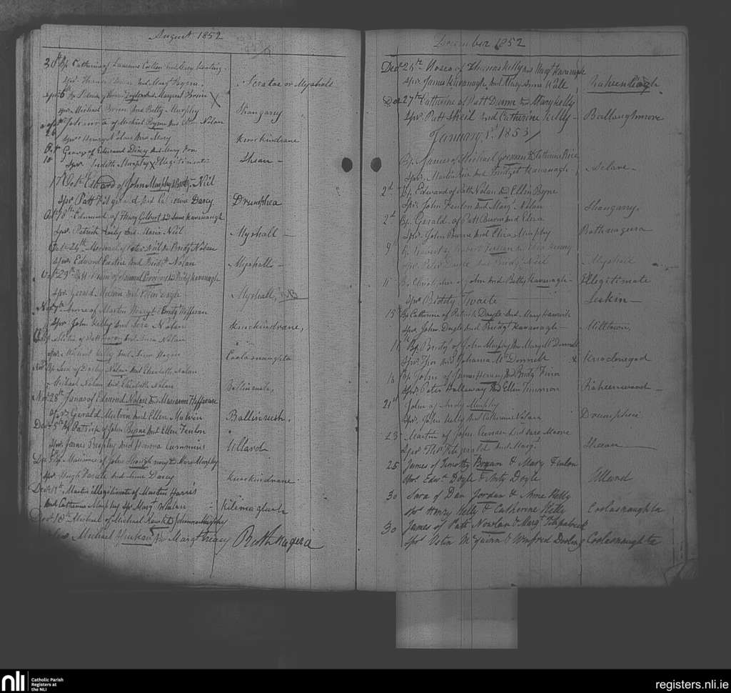 Myshall; County of Carlow; Diocese of Kildare and Leighlin. Baptisms, Aug. 1852 to Jan. 1853