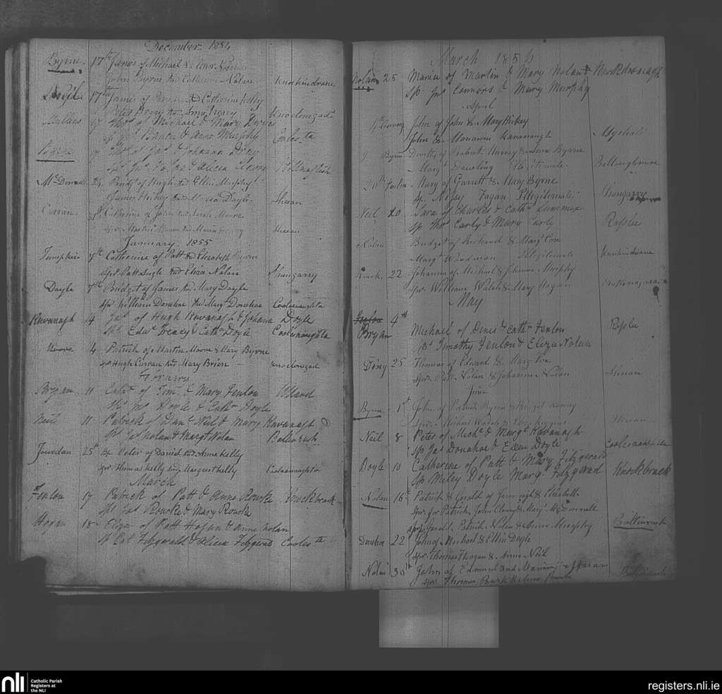 Myshall; County of Carlow; Diocese of Kildare and Leighlin. Baptisms, Dec. 1854 to June 1855