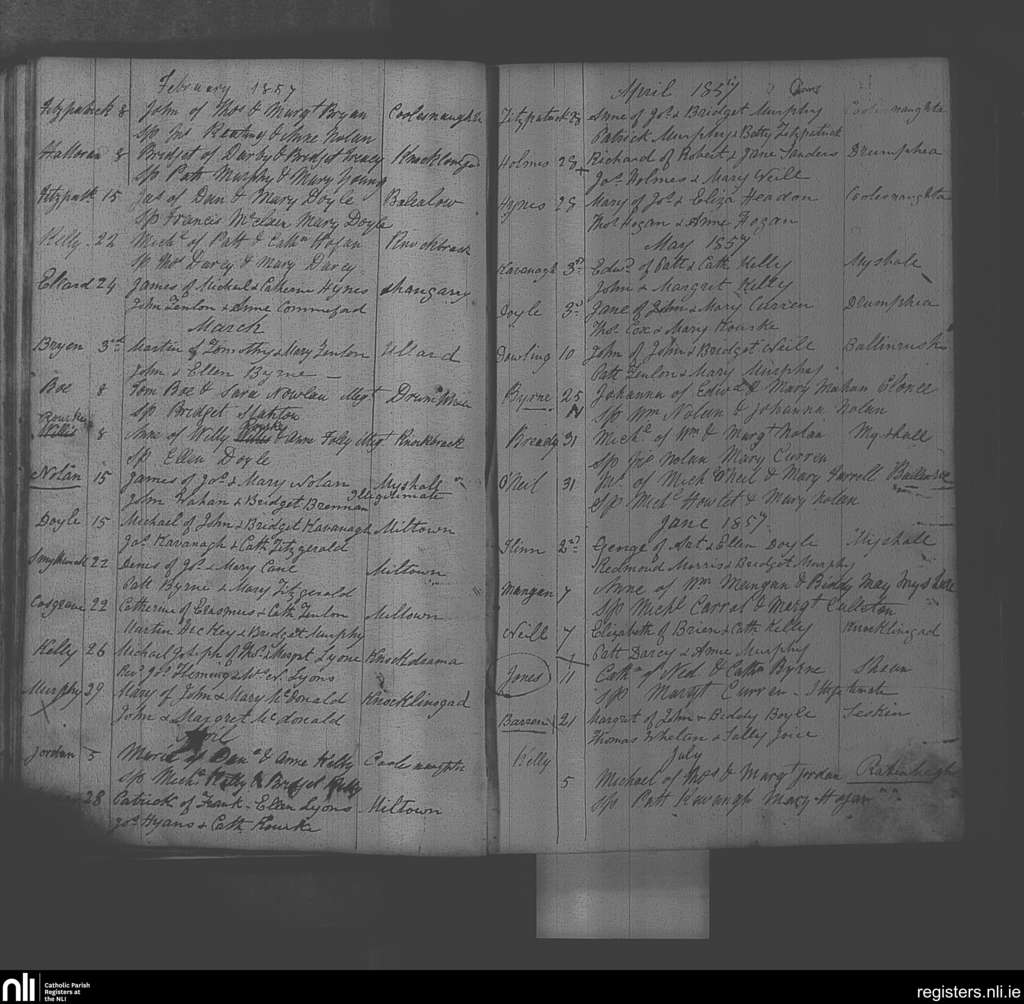 Myshall; County of Carlow; Diocese of Kildare and Leighlin. Baptisms, Feb. 1857 to July 1857