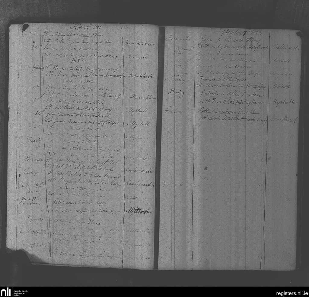 Myshall; County of Carlow; Diocese of Kildare and Leighlin. Marriages, Nov. 1851 to Oct. 1853