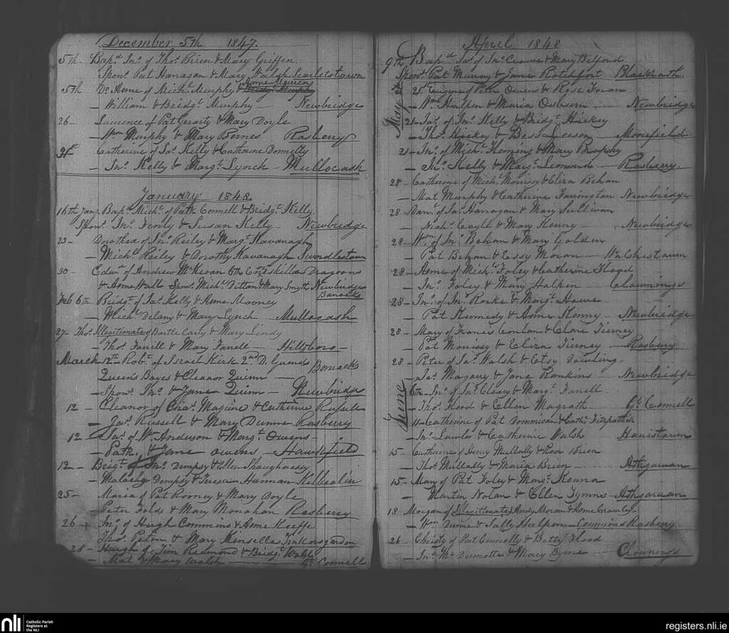 Newbridge; County of Kildare; Diocese of Kildare and Leighlin. Baptisms, Dec. 1847 to June 1848