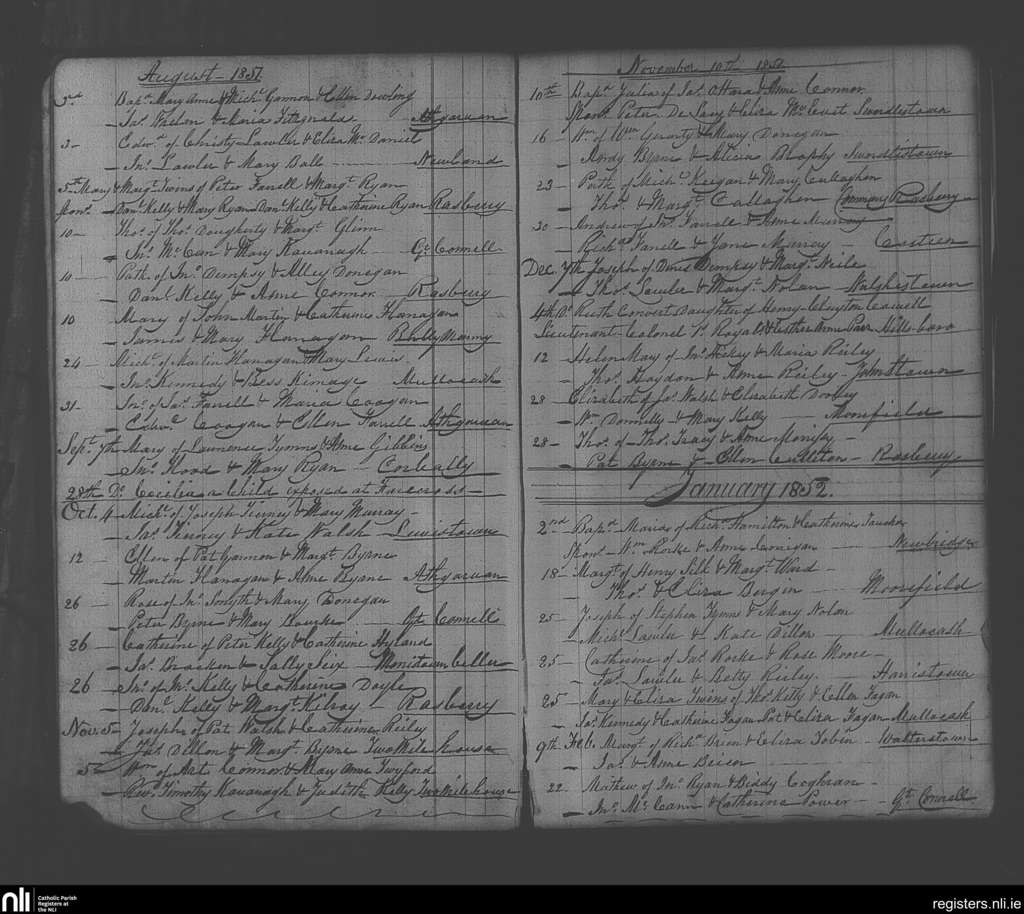 Newbridge; County of Kildare; Diocese of Kildare and Leighlin. Baptisms, Aug. 1851 to Feb. 1852