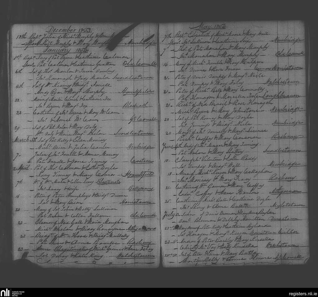 Newbridge; County of Kildare; Diocese of Kildare and Leighlin. Baptisms, Dec. 1853 to July 1854