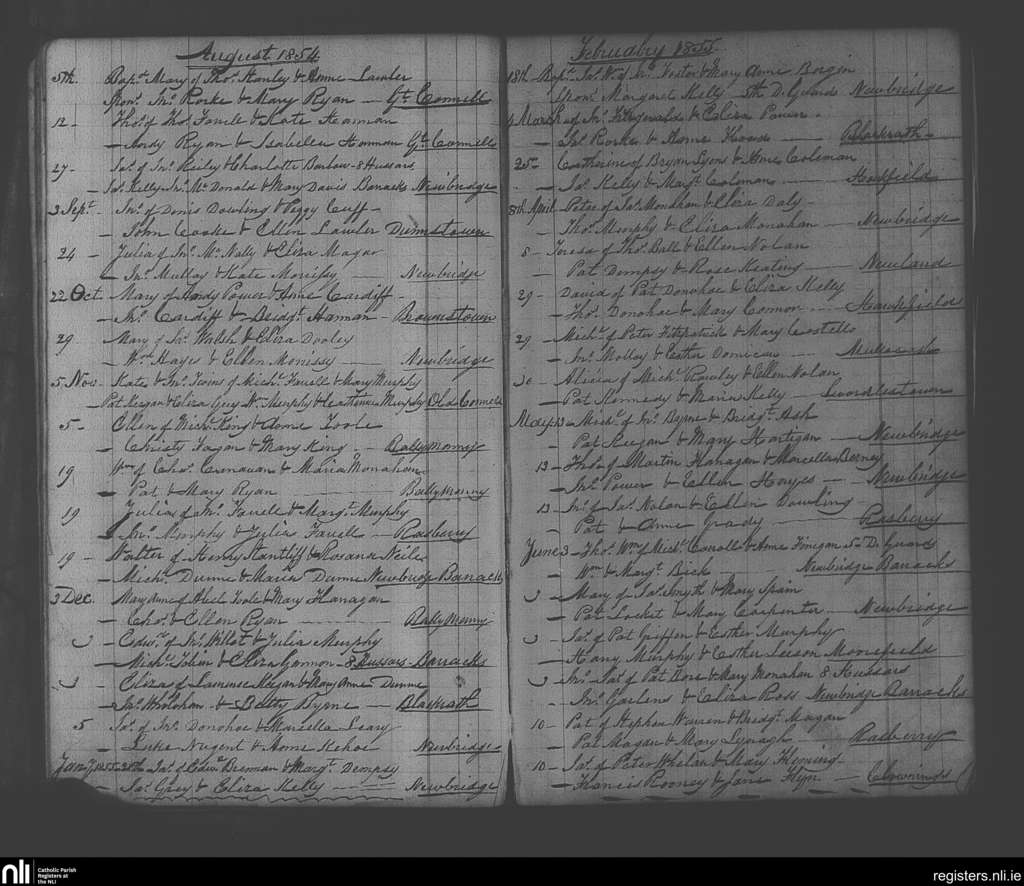 Newbridge; County of Kildare; Diocese of Kildare and Leighlin. Baptisms, Aug. 1854 to June 1855