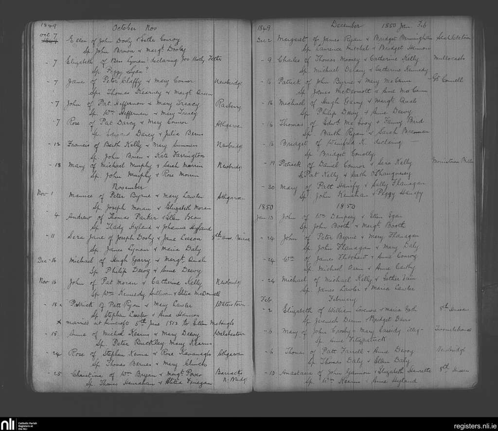 Newbridge; County of Kildare; Diocese of Kildare and Leighlin. Baptisms, Oct. 1849 to Feb. 1850