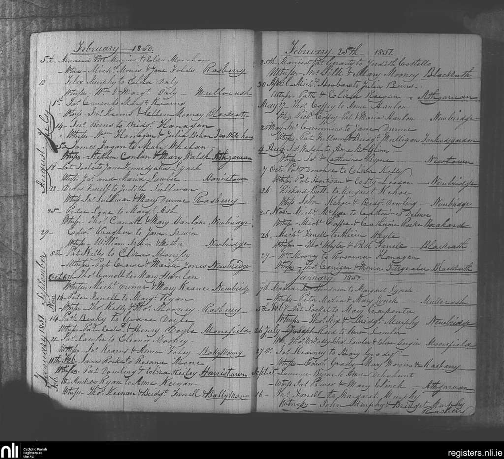 Newbridge; County of Kildare; Diocese of Kildare and Leighlin. Marriages, Feb. 1850 to Sep. 1852