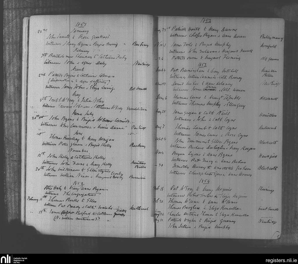 Newbridge; County of Kildare; Diocese of Kildare and Leighlin. Marriages, Jan. 1851 to Aug. 1854