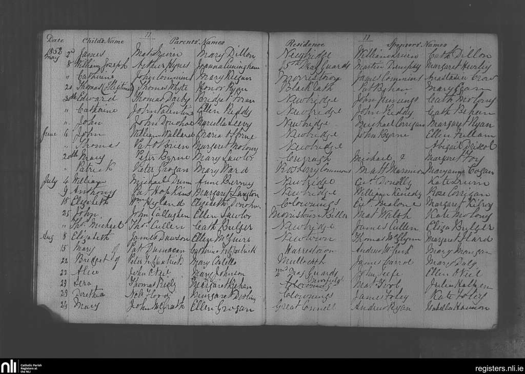 Newbridge; County of Kildare; Diocese of Kildare and Leighlin. Baptisms, May 1852 to Aug. 1852