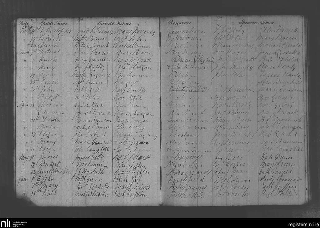 Newbridge; County of Kildare; Diocese of Kildare and Leighlin. Baptisms, Feb. 1856 to June 1856
