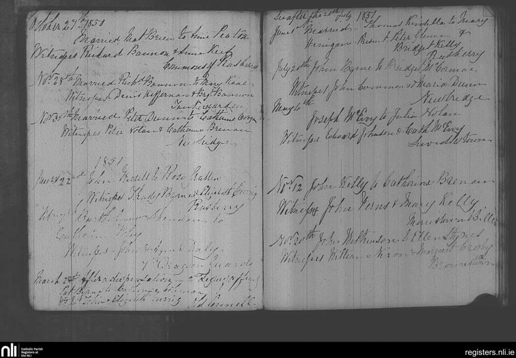 Newbridge; County of Kildare; Diocese of Kildare and Leighlin. Marriages, Oct. 1850 to Nov. 1851