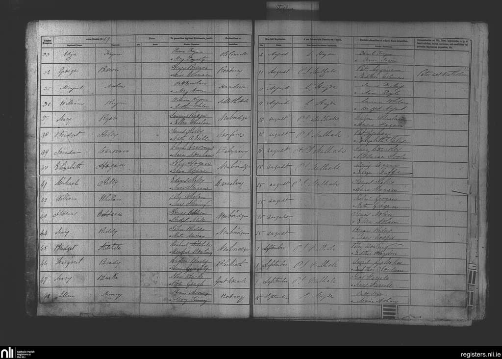 Newbridge; County of Kildare; Diocese of Kildare and Leighlin. Baptisms, Aug. 1867 to Sep. 1867