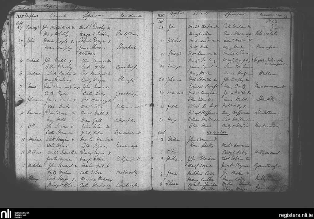Paulstown; County of Kilkenny; Diocese of Kildare and Leighlin. Baptisms, Sep. 1835 to Nov. 1835