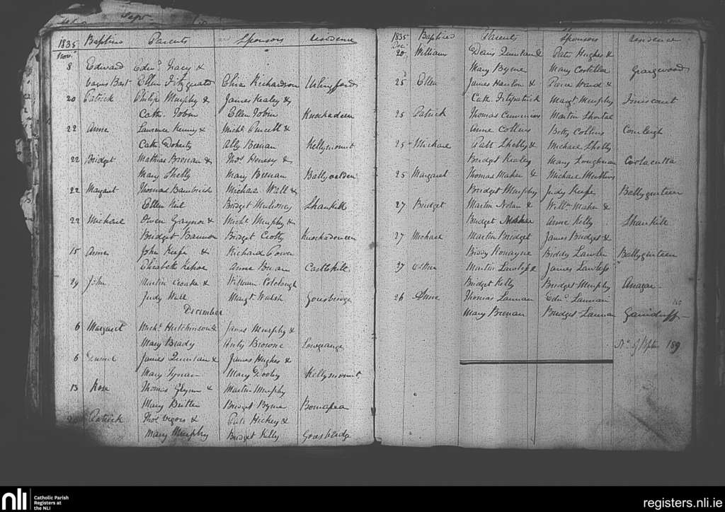 Paulstown; County of Kilkenny; Diocese of Kildare and Leighlin. Baptisms, Nov. 1835 to Dec. 1835