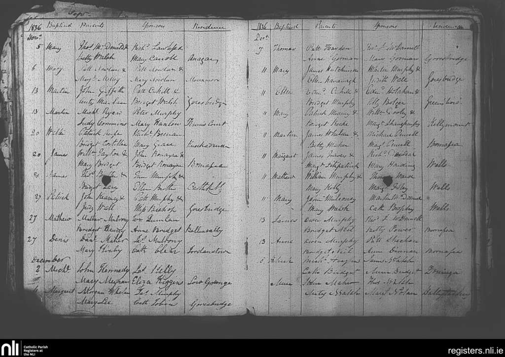 Paulstown; County of Kilkenny; Diocese of Kildare and Leighlin. Baptisms, Nov. 1836 to Dec. 1836