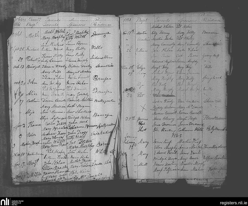 Paulstown; County of Kilkenny; Diocese of Kildare and Leighlin. Baptisms, Sep. 1861 to Jan. 1862