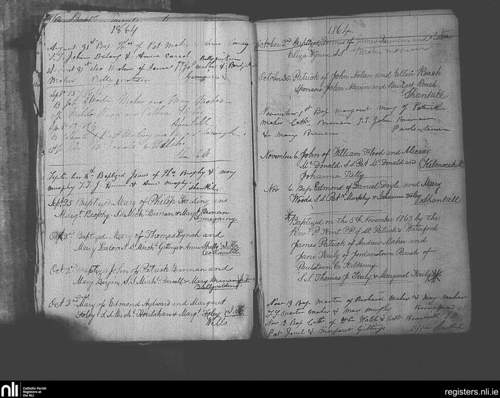 Paulstown; County of Kilkenny; Diocese of Kildare and Leighlin. Baptisms, Aug. 1864 to Nov. 1864