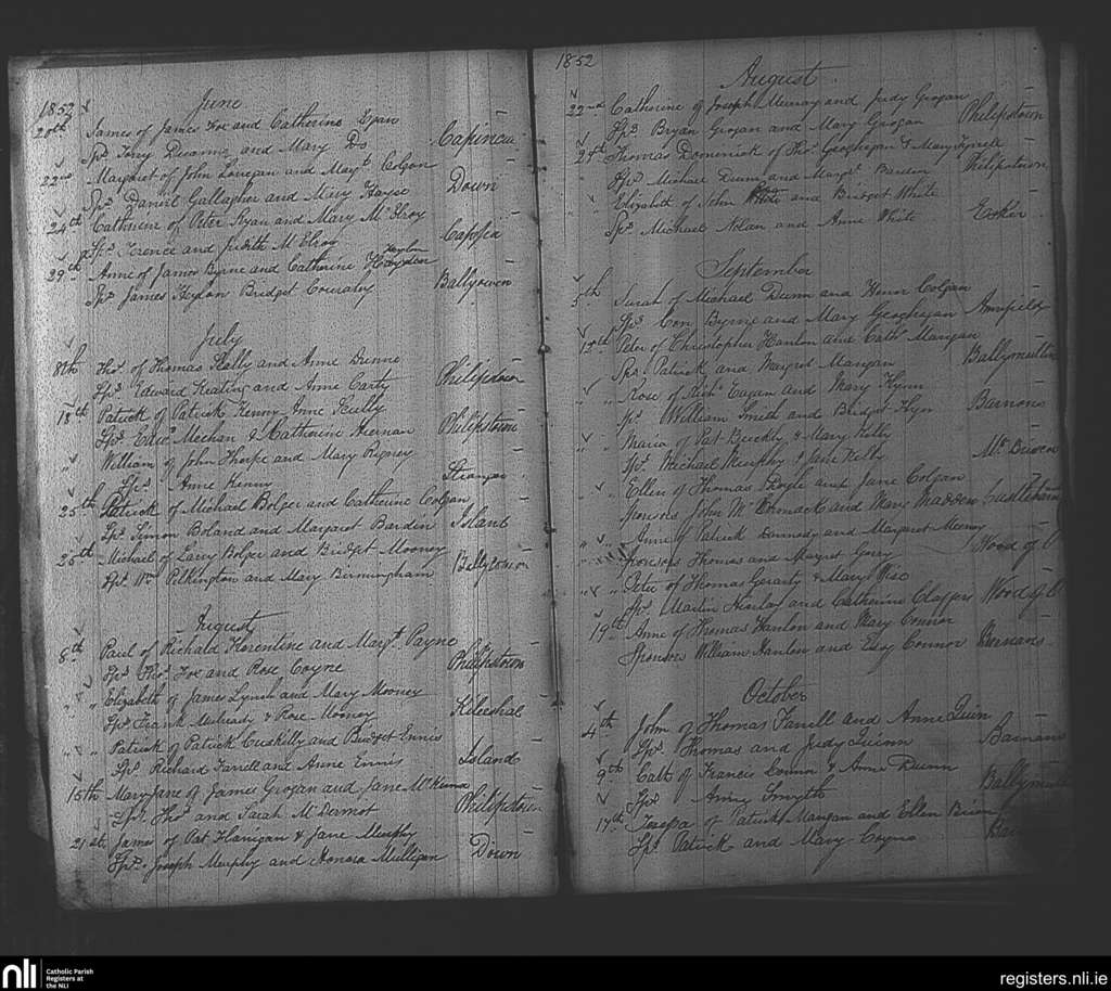 Philipstown; County of Offaly; Diocese of Kildare and Leighlin. Baptisms, June 1852 to Oct. 1852