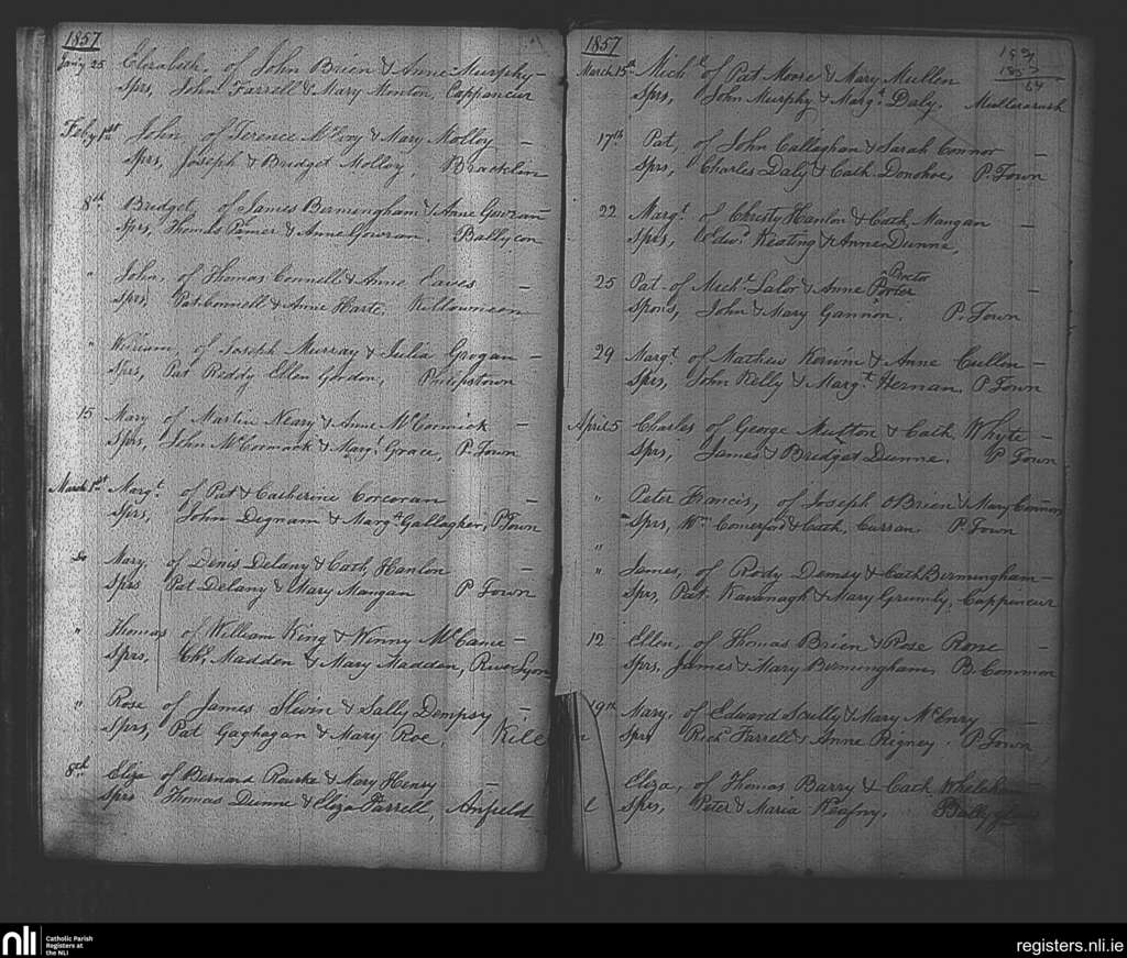 Philipstown; County of Offaly; Diocese of Kildare and Leighlin. Baptisms, Jan. 1857 to Apr. 1857