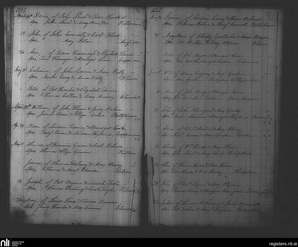 Philipstown; County of Offaly; Diocese of Kildare and Leighlin. Baptisms, Apr. 1857 to June 1857