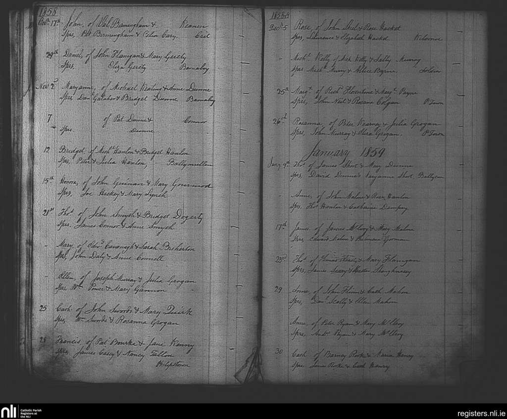 Philipstown; County of Offaly; Diocese of Kildare and Leighlin. Baptisms, Oct. 1858 to Jan. 1859