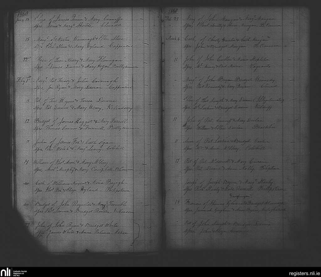 Philipstown; County of Offaly; Diocese of Kildare and Leighlin. Baptisms, Jan. 1860 to Mar. 1860
