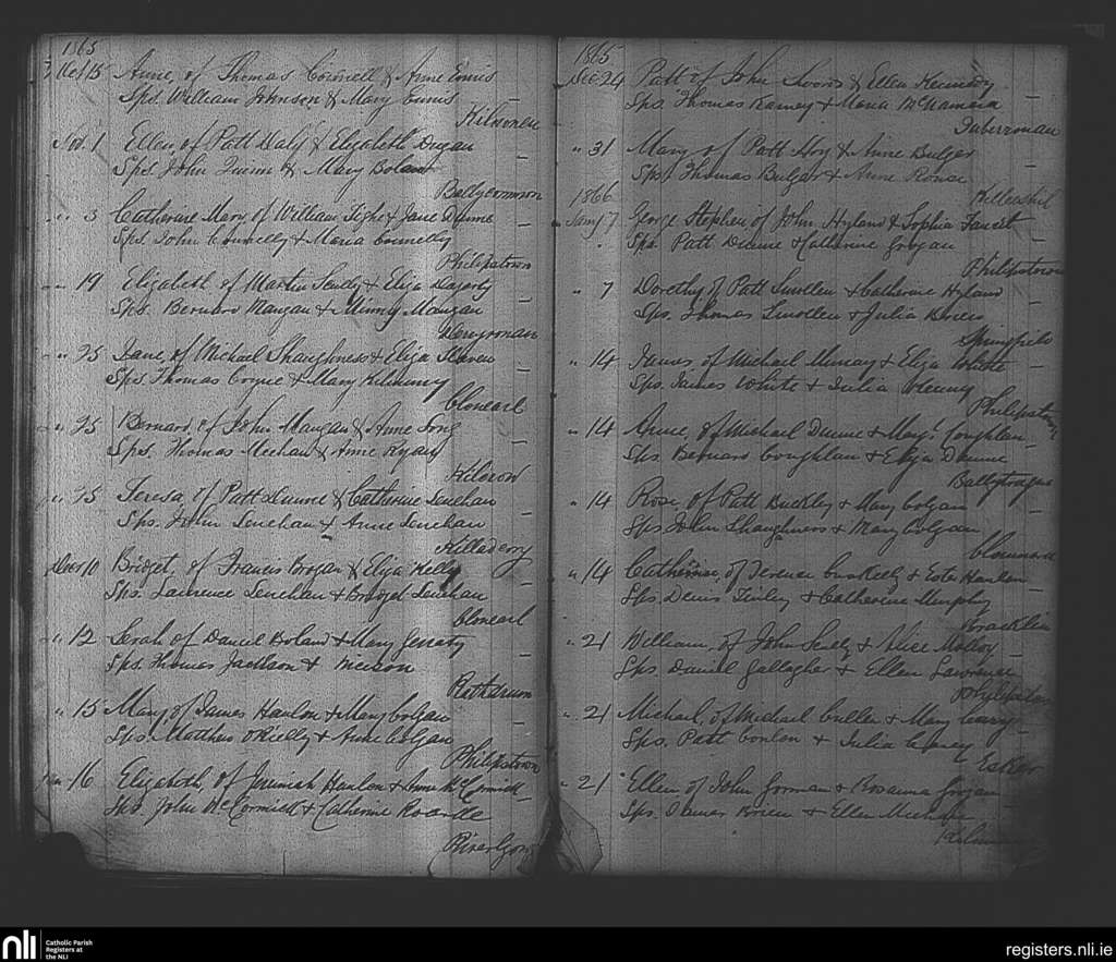 Philipstown; County of Offaly; Diocese of Kildare and Leighlin. Baptisms, Oct. 1865 to Jan. 1866