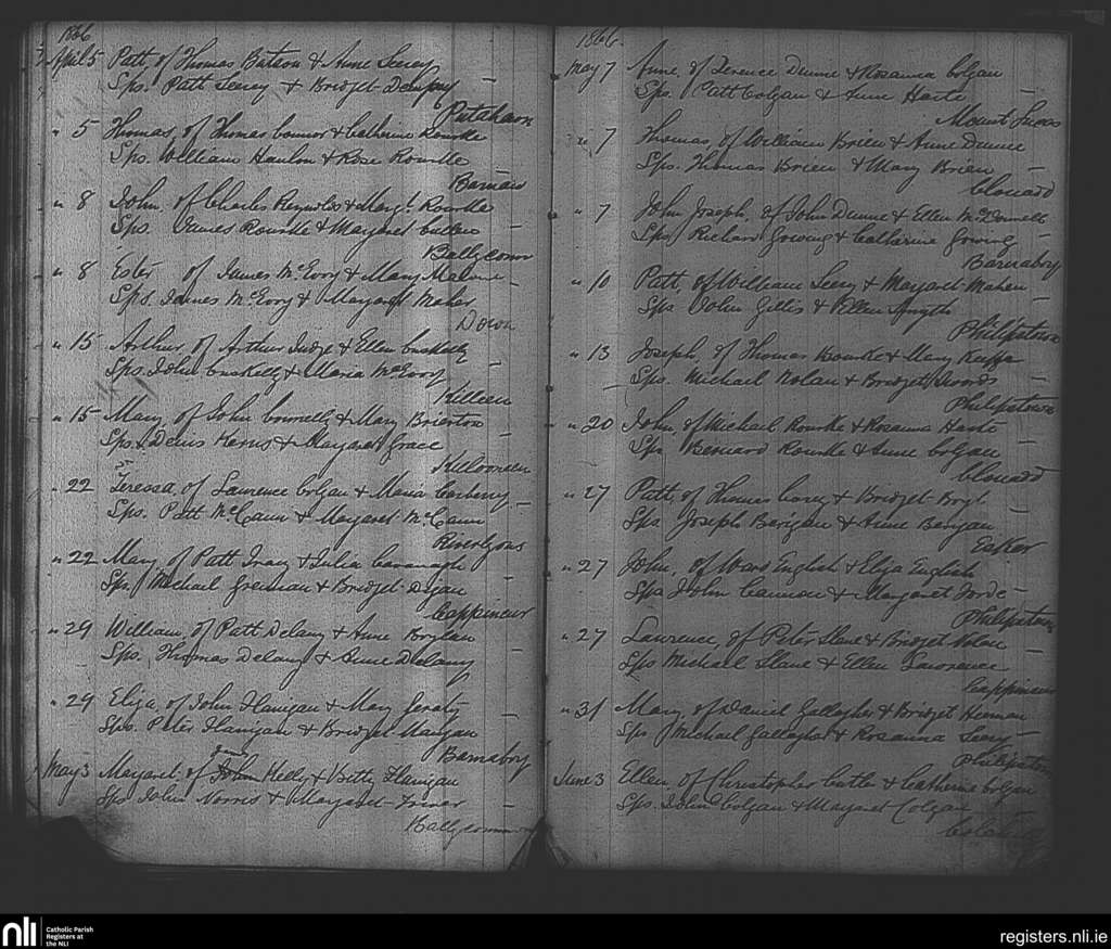 Philipstown; County of Offaly; Diocese of Kildare and Leighlin. Baptisms, Apr. 1866 to June 1866