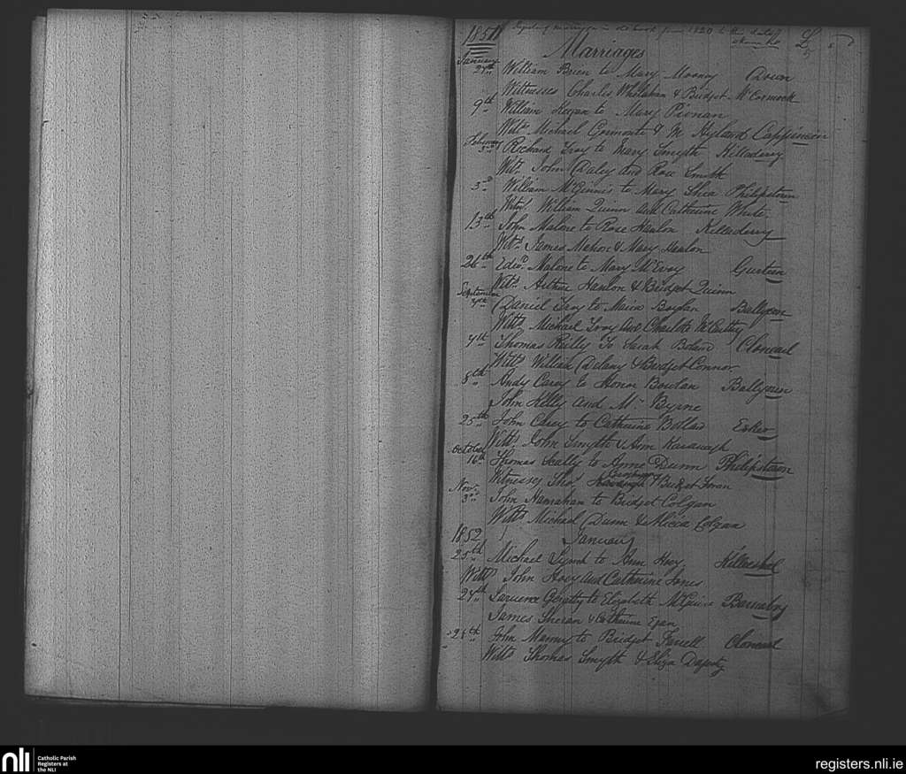 Philipstown; County of Offaly; Diocese of Kildare and Leighlin. Marriages, Jan. 1851 to Jan. 1852