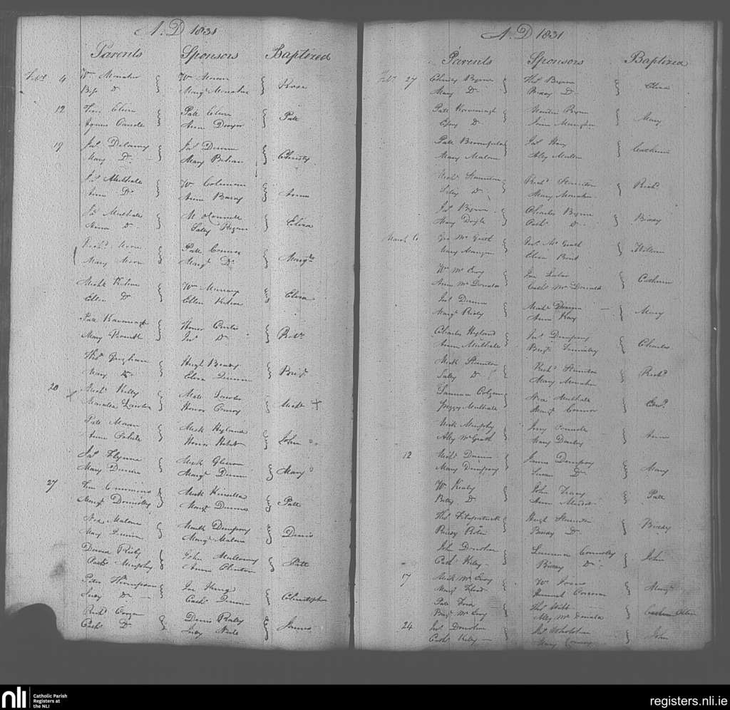 Portarlington; County of Laois, Offaly; Diocese of Kildare and Leighlin. Baptisms, Feb. 1831 to Mar. 1831