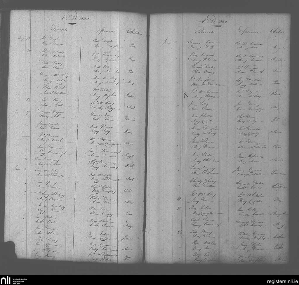 Portarlington; County of Laois, Offaly; Diocese of Kildare and Leighlin. Baptisms, May 1832 to June 1832