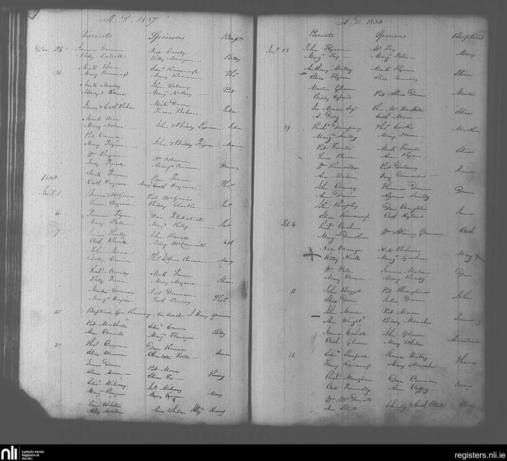 Portarlington; County of Laois, Offaly; Diocese of Kildare and Leighlin. Baptisms, Dec. 1837 to Feb. 1838