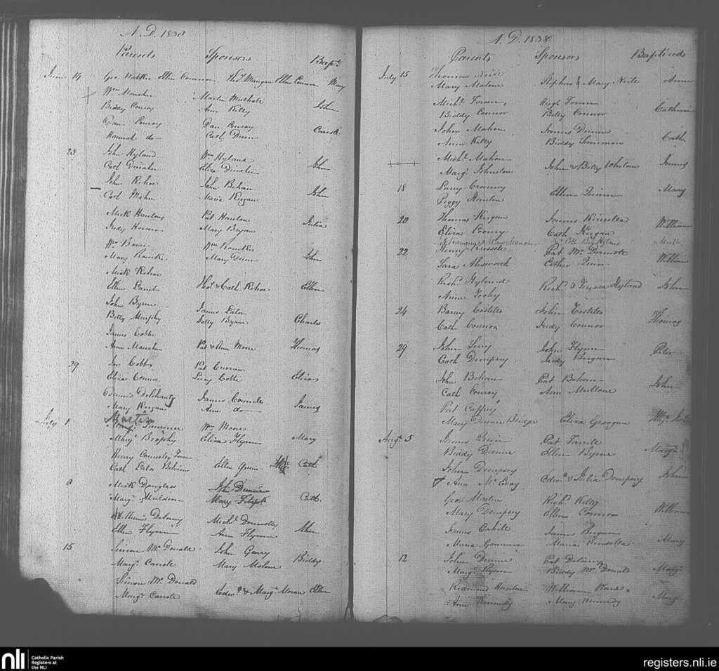 Portarlington; County of Laois, Offaly; Diocese of Kildare and Leighlin. Baptisms, June 1838 to Aug. 1838