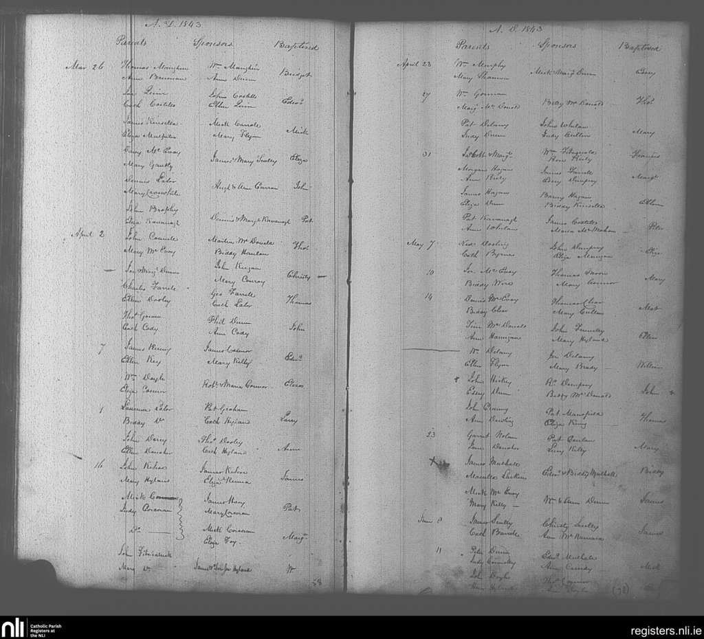 Portarlington; County of Laois, Offaly; Diocese of Kildare and Leighlin. Baptisms, Mar. 1843 to June 1843