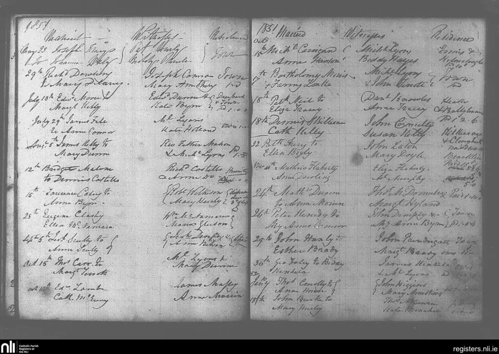 Portarlington; County of Laois, Offaly; Diocese of Kildare and Leighlin. Marriages, May 1851 to Jan. 1852