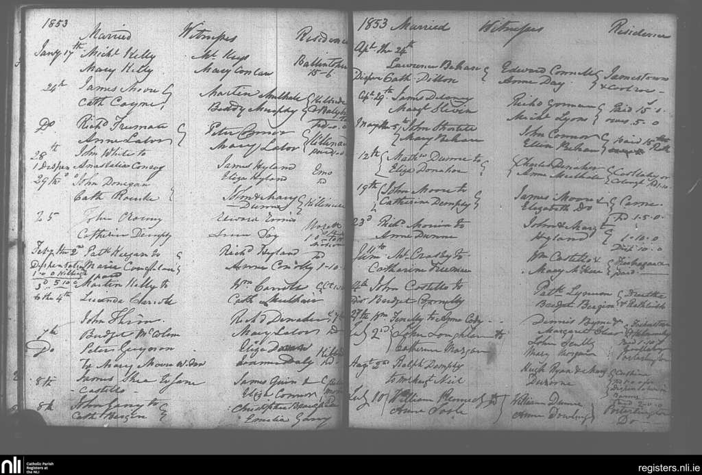 Portarlington; County of Laois, Offaly; Diocese of Kildare and Leighlin. Marriages, Jan. 1853 to Aug. 1853