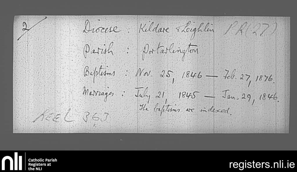 Portarlington; County of Laois, Offaly; Diocese of Kildare and Leighlin. Baptisms, Marriages